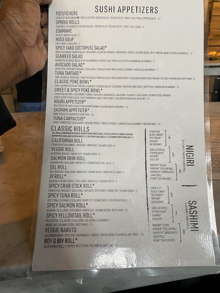 The menu at Jony's Sushi offers a wide variety of dishes, perfect for those looking to enjoy both traditional and creative sushi options. The appetizer selection includes flavorful options like Potstickers Pork & Chicken and Potstickers Vegetarian as well as comforting classics such as Miso Soup and Edamame. For those looking to enhance their meal, sushi extras like Ponzu Sauce, Spicy Mayo, and Kimchee Sauce are available, along with Sesame Seeds and Wasabi Aioli. The Nigiri A La Carte and Sashimi A La Carte provide fresh, high-quality choices for sushi aficionados. For something a little more exciting, the specialty rolls stand out with creations such as the Shrimp Tempura Roll, Mr. Miyagi Roll, and the bold Mother Of Dragons Roll. Meanwhile, the JV Deluxe Roll offers a luxurious option for those seeking a premium experience. The classic rolls, like the Spicy Salmon Roll, Spicy Tuna Roll, and California Roll, deliver a satisfying and familiar taste. Whether you're in the mood for a light appetizer or a filling roll, Jony's Sushi provides an impressive array of choices to suit all tastes.